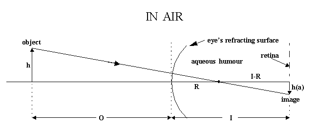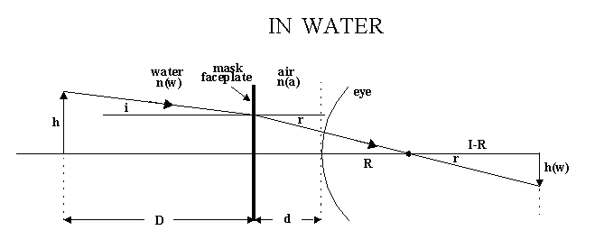 For the same relative positions of object and eye, but with the object in water and the eye in air behind a water-air interface, the configuration is as shown below. Note the refraction at the faceplate, with angle of incidence 'i' and angle of refraction 'r', and the magnified retinal image.