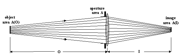 The brightness of the object is given by its luminance B, which is related to the visible light power emitted per unit surface area per unit solid angle. The solid angle subtended by the aperture at the (small) object is A/O^2 (the caret indicates exponentiation). The total power passing through the aperture is therefore (luminance) times (object area) times (solid angle subtended by the aperture), which is