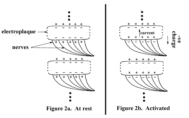 Figure 2a shows a lateral view of part of a stack in its rest state. The vertical scale has been greatly exaggerated for clarity. The interior of the electroplaque is negatively charged, the result of selective permeability by the upper and lower cell membranes as concentration gradients drive the movements of ions across the membranes. In the steady state with both membranes equally polarized, negative inside and positive outside, they are at the same electrostatic potential, and there is no current flow across the cell.