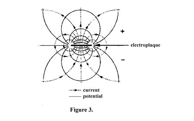The distribution of charge during cell activation is time-dependent, but at any given instant it produces a scalar electric potential (and corresponding electric field) which can drive the movement of free charges in the gelatinous conducting medium surrounding the electroplaque as well as in the medium external to the ray's body. Figure 3 shows a typical distribution of equipotentials and lines of current flow for a single electroplaque. When all of the ray's electroplaques activate simultaneously in this manner, the resulting external currents can be strong enough to disable nearby biological organisms.