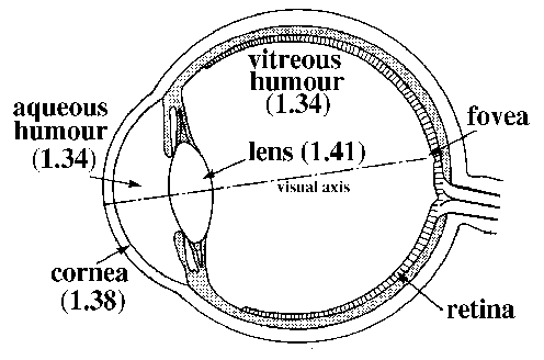 While in contact with air, the normal human eye does a wonderful job of feeding accurate visual information to the brain. In contact with water, however, it fails miserably. To understand why, we need to examine the eye's optical properties. The figure below shows a lateral cross-section of the human eye (taken from Hallett et al). The number accompanying the label of each eye component is its index of refraction. In particular, note that the index of refraction of the cornea, n(c), is 1.38.