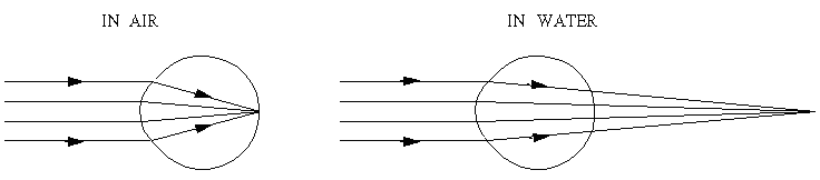 The cornea has lost 41.2 diopters (87%) of its refracting power! This means that, underwater, the eye becomes severely hyperopic (or hypermetropic), so that parallel rays of light entering the relaxed eye are no longer brought to a focus on the retina, but well behind it (see below) so that everything is a blur.